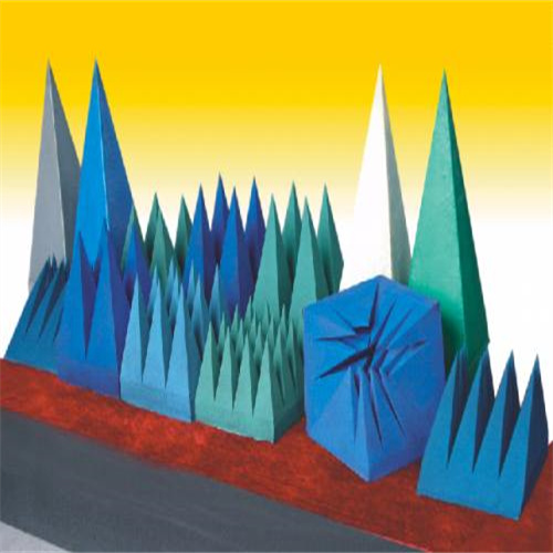 JA microwave pyramidal absorber aligned light blue quadrangular pyramid, possessing good fireproof performance which fulfills American NRL Report 8093.Service temperature: -50 ℃ ~ 70 ℃ . It is of good vertical incidence 、 oblique incidence 、 scattering and isolated decay performances at the wideband range. It is mainly used for subject material of anechoic chambers.